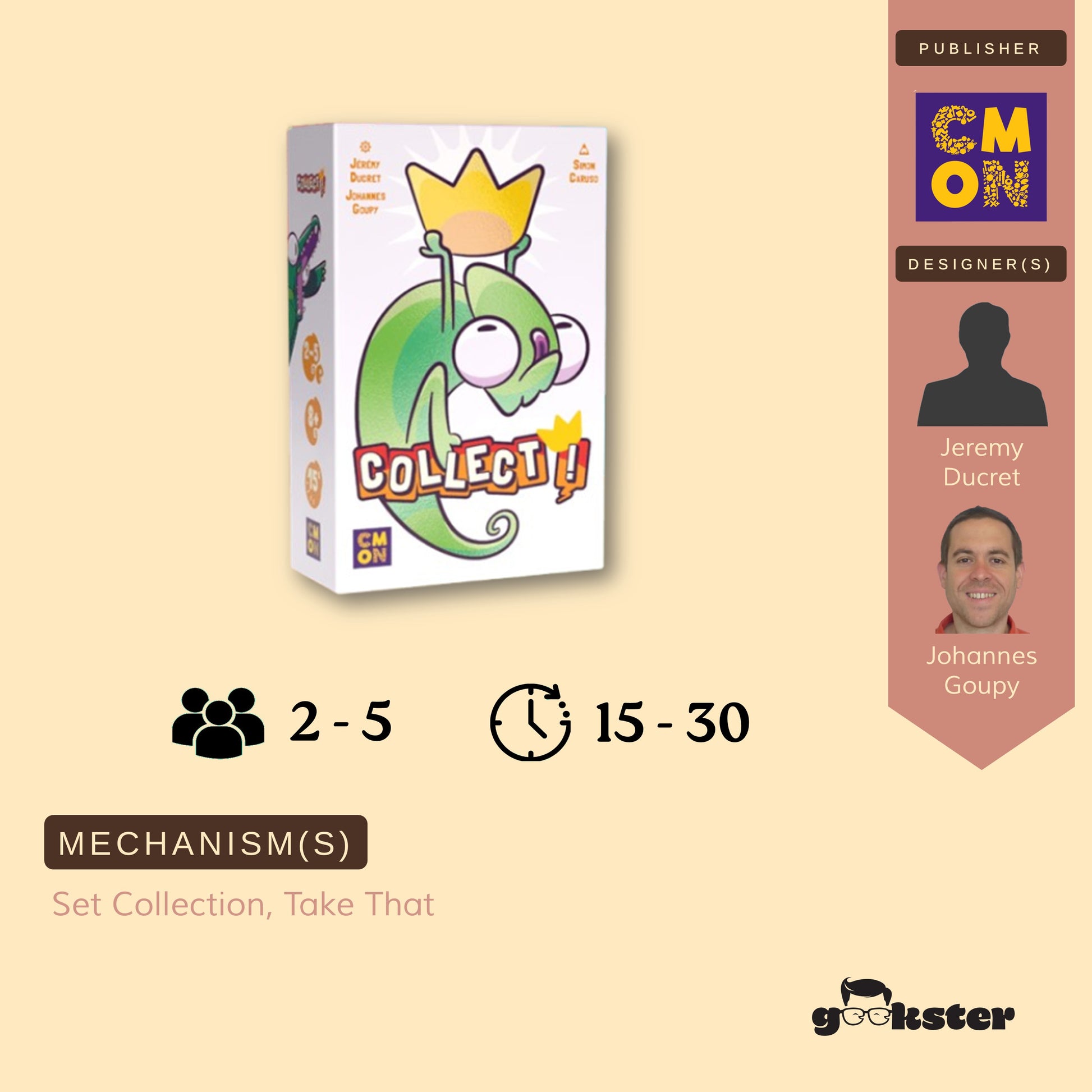 Collect! is quick to learn, plays in about 15 minutes, and is packed with wild twists. With 8 unique animals and plenty of replayability, it’s a colorful card game that’s easy to take anywhere, and impossible to put down.