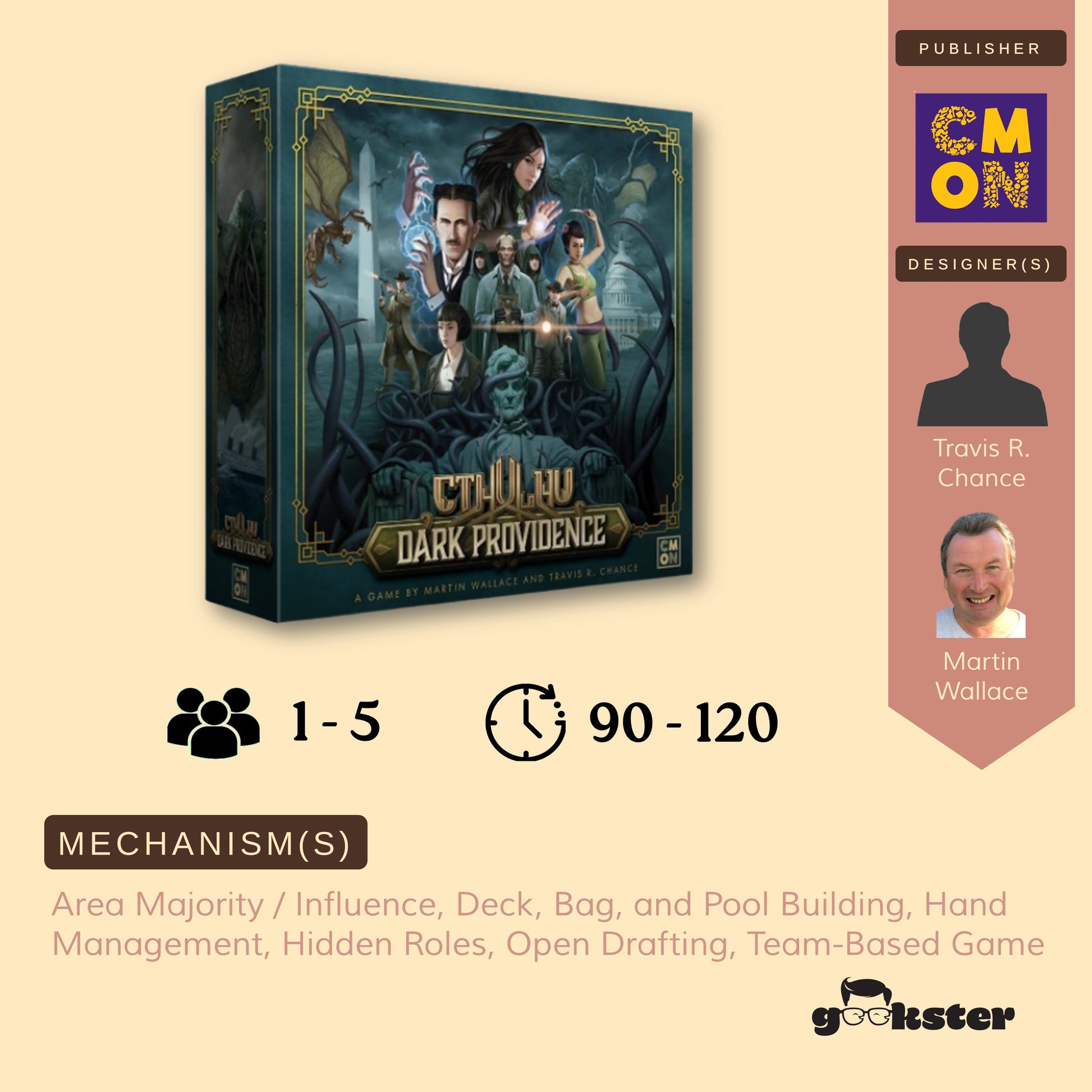 Set in the Cthulhu: Death May Die world and inspired by the writings of H.P. Lovecraft, Dark Providence is a competitive game in which players take on secret roles of Investigators and Cultists from the most influential cities of the United States during the Great Depression.