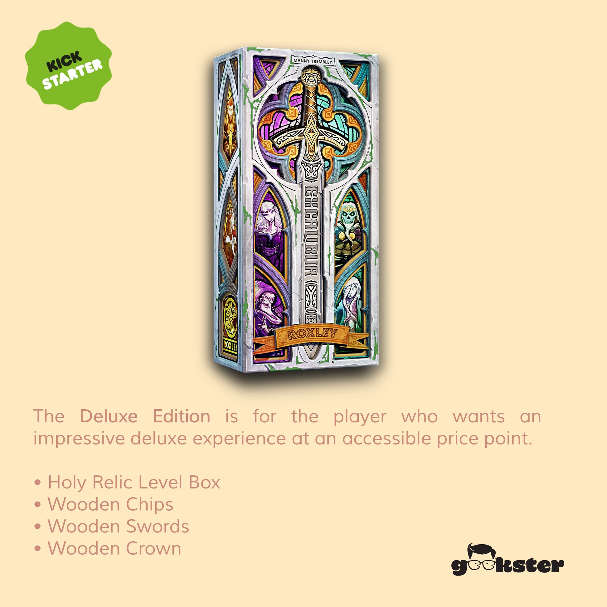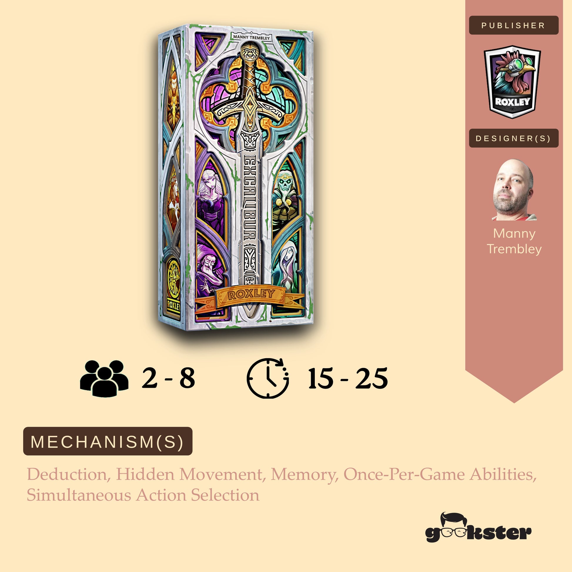Excalibur is a party game filled with bluffing and subterfuge. Draw tiles from Avalon to find Excalibur, then use the powers of Arthurian legends to keep it safe from the other would-be kings 'round the table!
