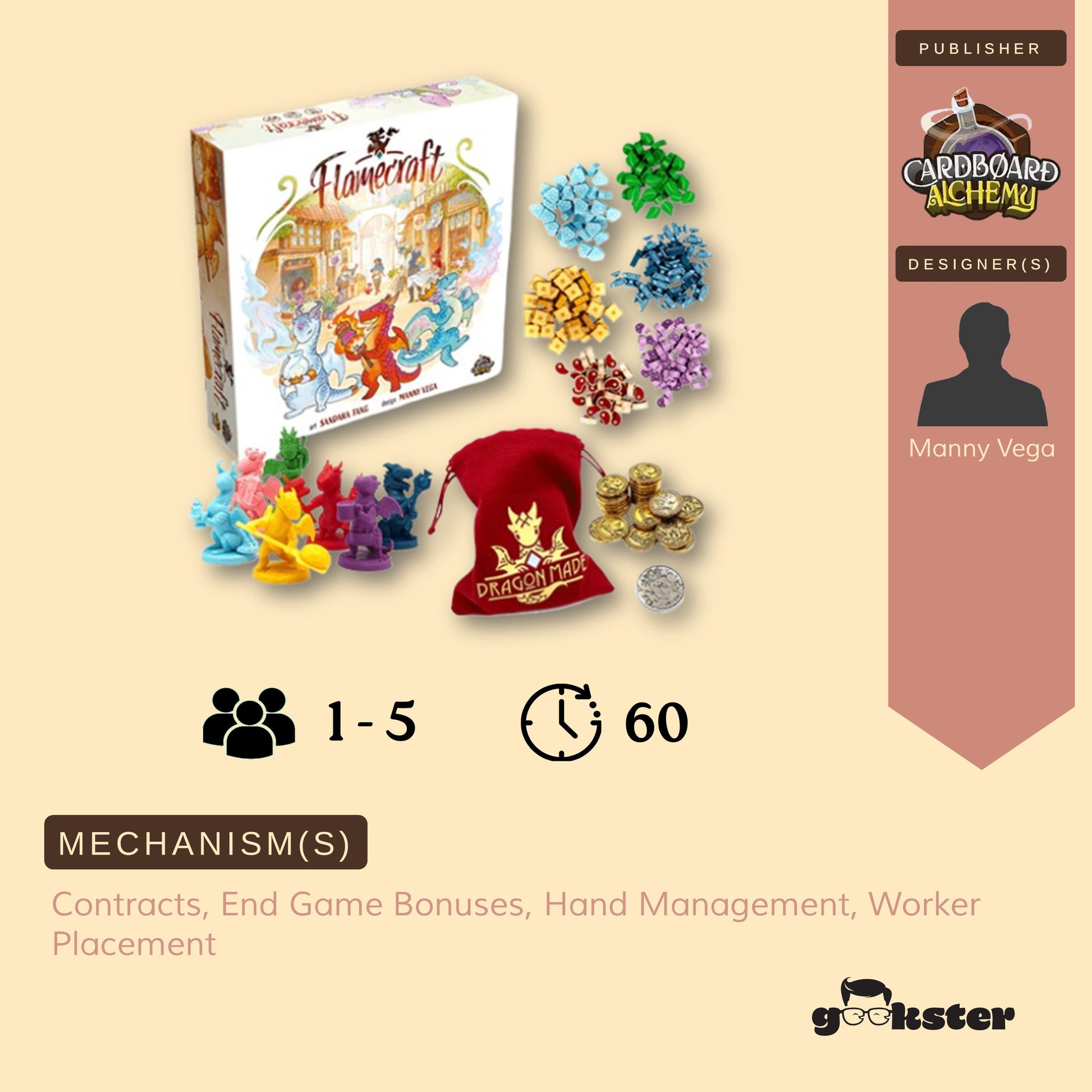 Artisan dragons, the smaller and magically talented versions of their larger (and destructive) cousins, are sought by shopkeepers so that they may delight customers with their flamecraft. You are a Flamekeeper, skilled in the art of conversing with dragons, placing them in their ideal home and using enchantments to entice them to produce wondrous things. Your reputation will grow as you aid the dragons and shopkeepers, and the Flamekeeper with the most reputation will be known as the Master of Flamecraft.