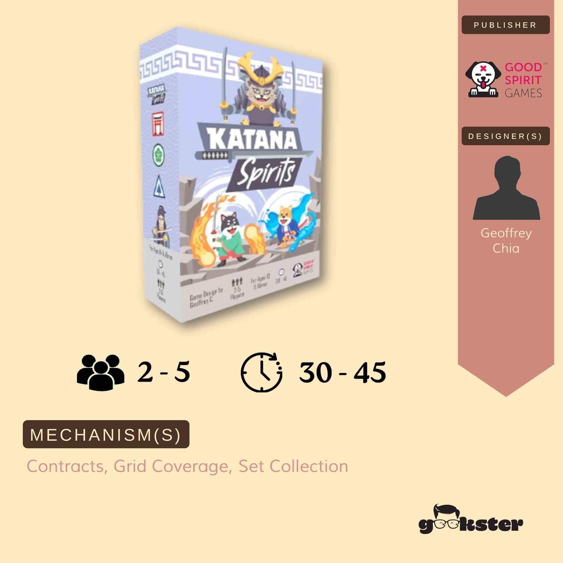 Players assume the role of canine swordsmen who train their elemental Katana skills with polyomino tiles and defeat multiple enemies to earn points. On each player’s turn, the player is required to perform one of the following actions: