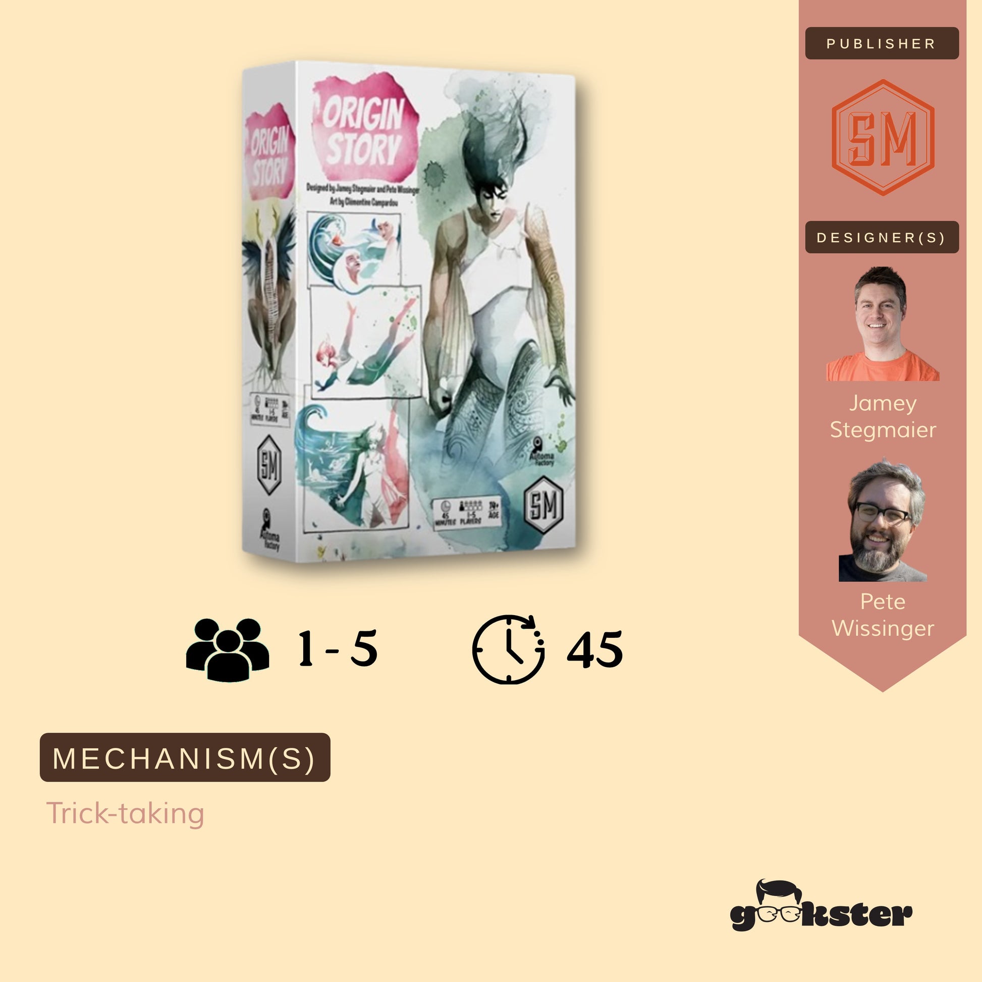 Origin Story is a 1-5 player competitive tableau-building, trick-taking game played over 5 rounds. Each round represents a chapter in your development and grants a new card to add to your player mat. Charge your cards and use their abilities to score more points than your opponents.
