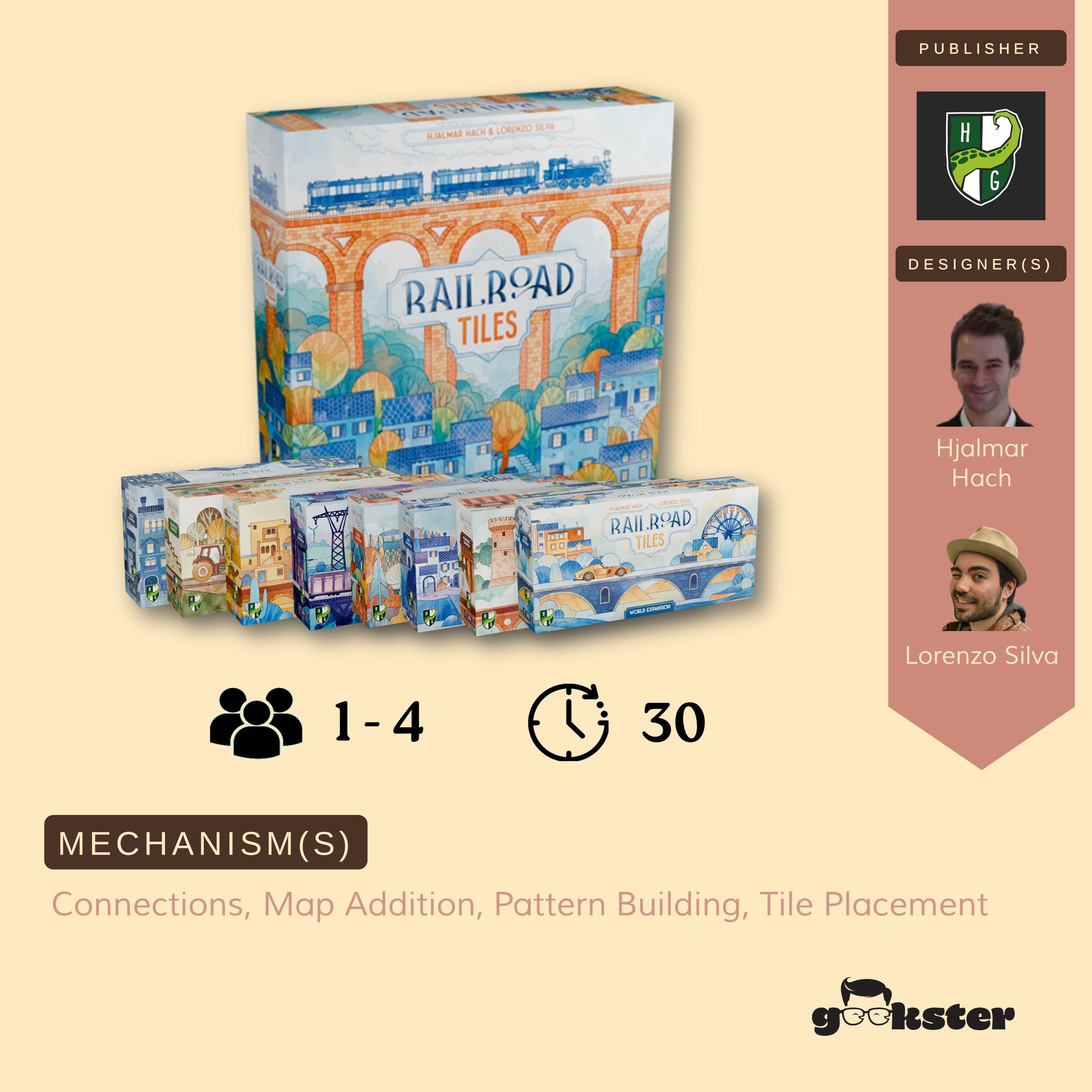 Railroad Tiles, a sequel to the roll-and-write series Railroad Ink, is a quick-playing tile placement game in which you pick tiles and place routes to build an interconnected community.