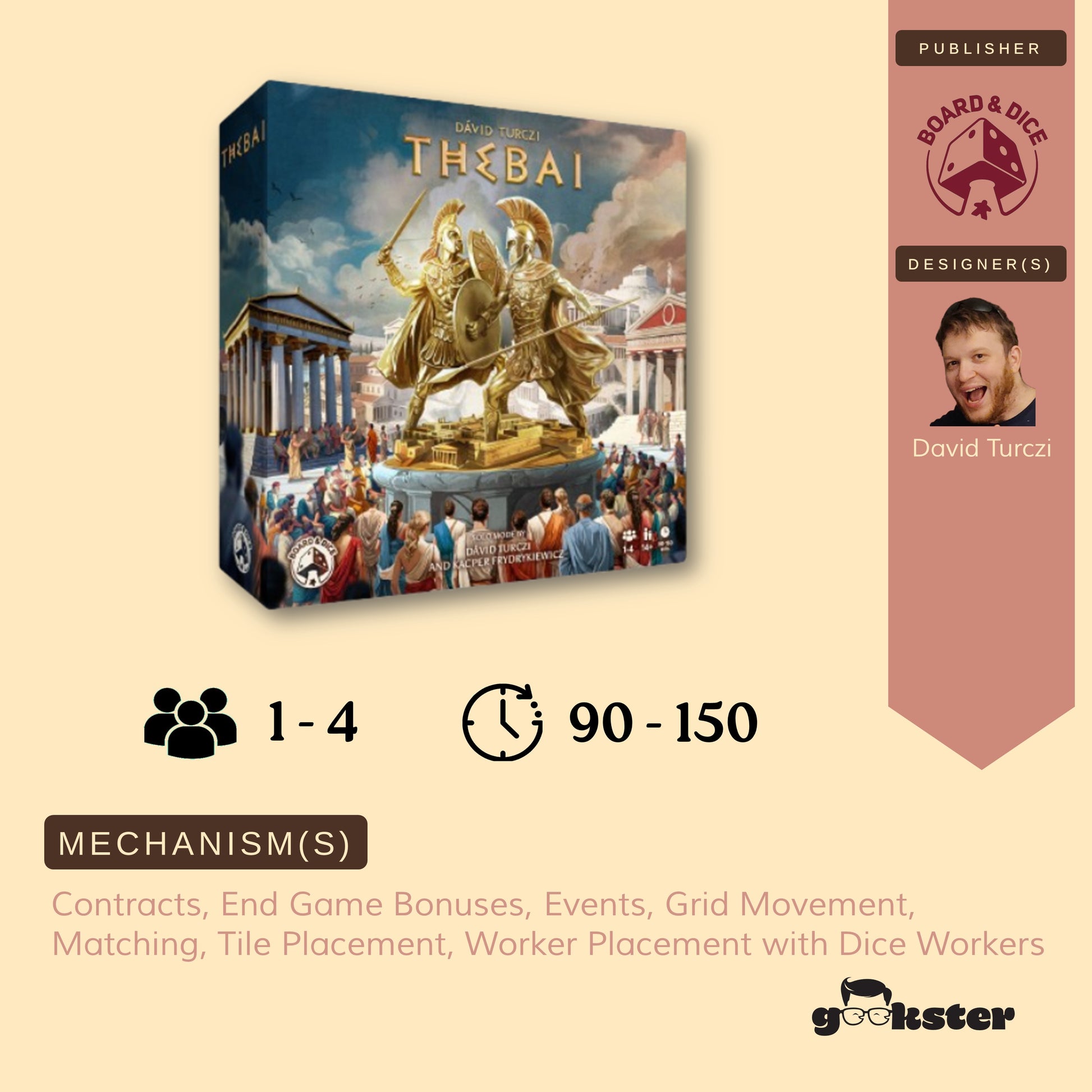 In Thebai, players assume the role of influential leaders from noble families during the tumultuous late Bronze Age. Throughout the game, players are tasked with rebuilding the Cadmea, the citadel of Thebes, while restoring the city’s exports, praying to the gods of the city, and protecting the lives of the citizens as grand heroes spill each other’s blood outside the gates.