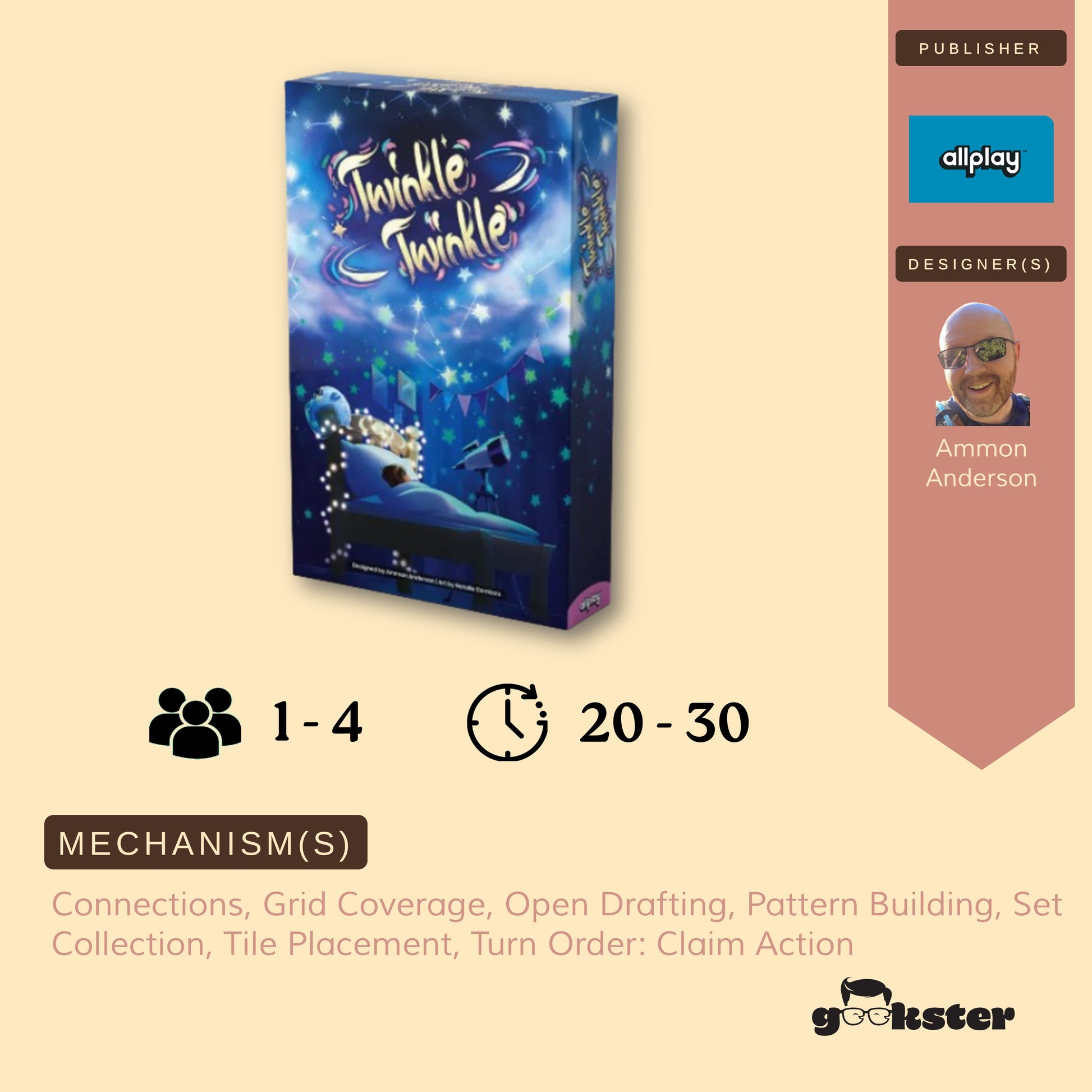In the tile-laying game Twinkle Twinkle, you'll fill your star chart with clear plastic tiles, trying to connect constellations, build belts of asteroids, collect comets, pick up planets, and study them with satellites. Take care with those pesky black holes - unless you have a perfect spot for them, of course.